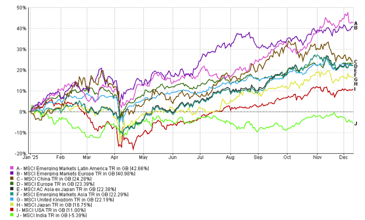 This update covers the period year to date to 10 December 2025. On the surface, looking at markets over the last few weeks, it might seem little has changed but under the surface, we are witnessing a ratcheting up of some major geopolitical situations and some renewed questioning of AI related stock valuations. The winners (Fig.1) however have remained broadly the same, though China continues to give back performance with significant economic headwinds yet to be offset by sufficiently increased stimulus.