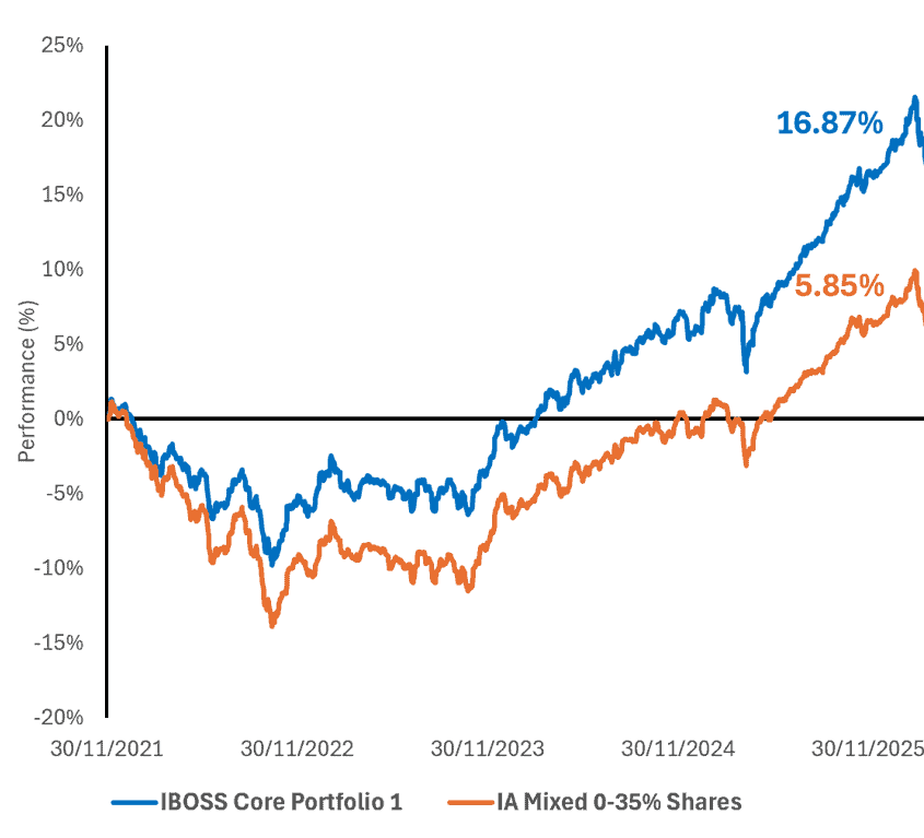 History gives us reassurance here. A clear example is the IBOSS Core MPS 1 fixed income positioning in 2022, the year of the UK mini budget. At that time we did not predict the budgetary outcome but we did underweight sovereign bonds based on their risk/return profile. It seemed that this was a picking up pennies in front of the steamroller like scenario. So, despite a large-scale gilt sell-off alongside an equity sell-off, the portfolio had a lower initial drawdown and has outperformed its benchmark by nearly three times since then. This is a demonstration of how a diversified and actively managed approach can help weather periods of market volatility and uncertainty.