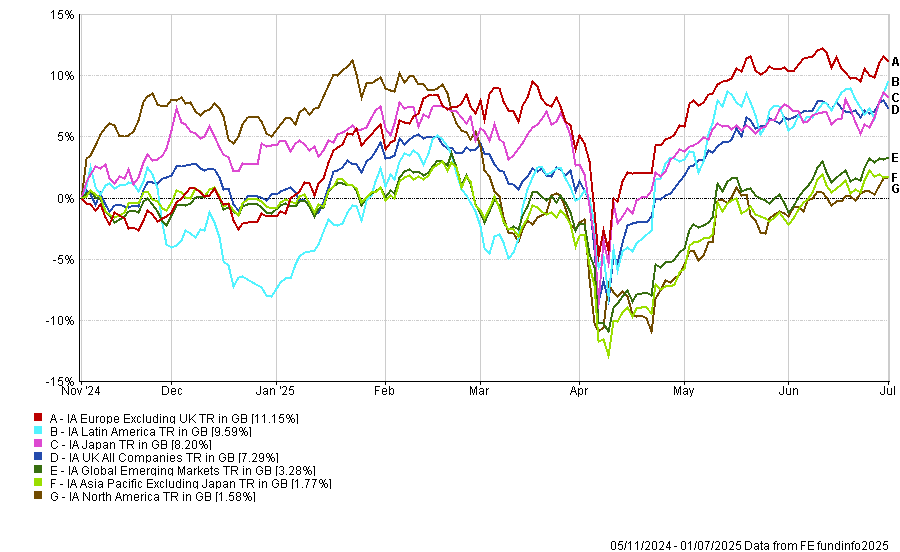 This update covers the period up to July 9th. This update primarily covers the first half of 2025, but we have extended it back to November 5, 2024, to encompass the entirety of Trump’s second presidency. As usual, we used the basic asset classes as a proxy for the broader markets (Fig. 1). Those more familiar with IBOSS will have often heard us talk of ‘key dates’ which signify market, geographic or sector inflexion points. Approximately three weeks after his election win, it became clear that the tariff situation would be much messier, more complex, and less conclusive than many investors had hoped for. It has since been argued that it also definitively ended the period of peak globalisation.