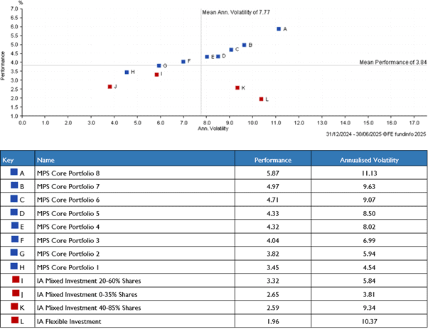 IBOSS Core MPS Portfolios & IA Benchmarks Performance Against Volatility – 31/12/2024-30/06/2025