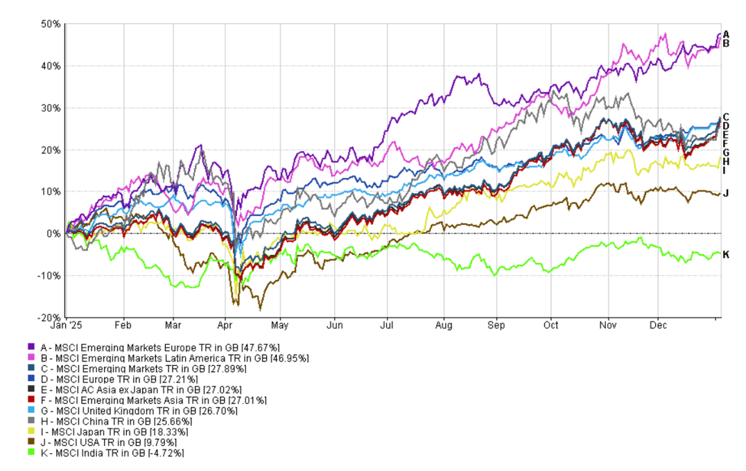 Another key contributor to returns has been fund selection. In 2025, active managers have had ample opportunity to outperform (and underperform) their respective benchmarks. As a result, we have seen a huge difference between the best and worst performing funds across various regions. The chart below highlights the performance of the funds broken down into individual regions through the year.