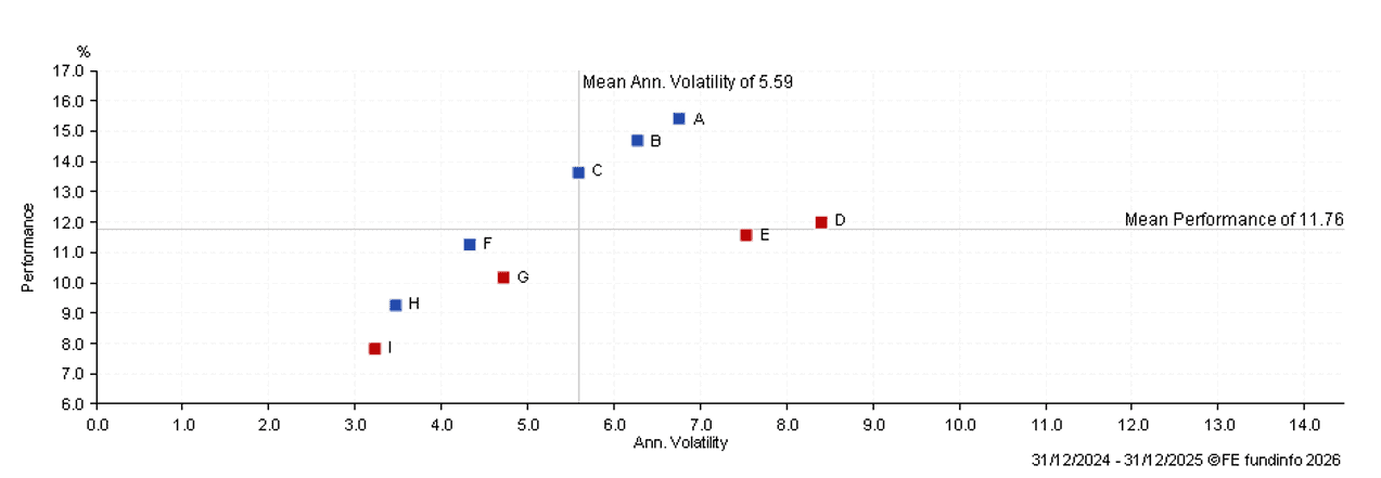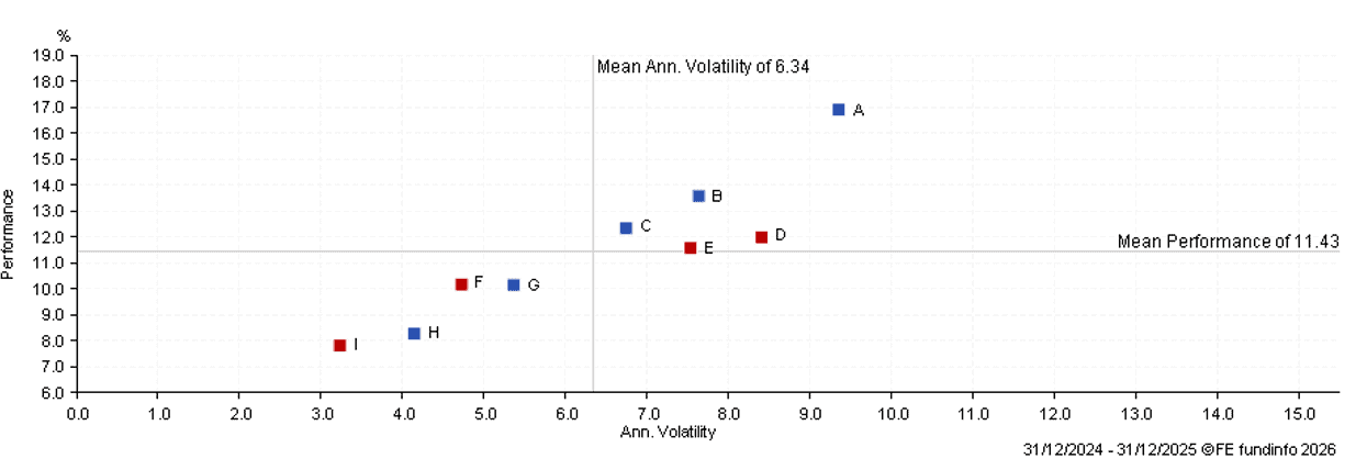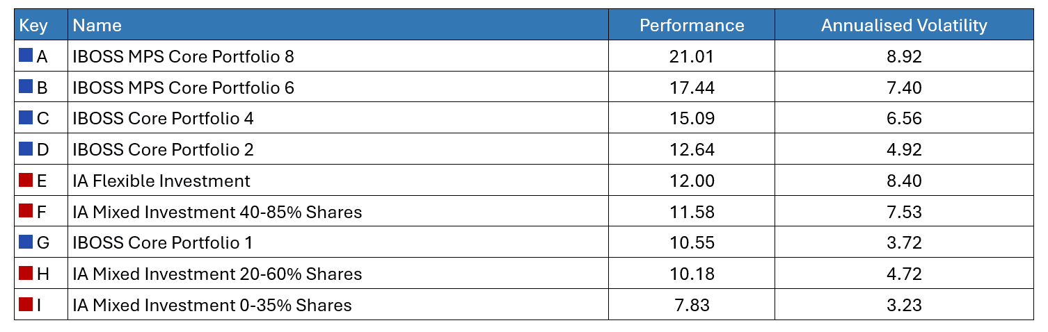 The scatter chart below highlights one-year performance against annualised volatility for IBOSS Core Portfolios compared with IA peer group benchmarks, reinforcing the strength of IBOSS’s risk-adjusted returns, even over this shorter period.