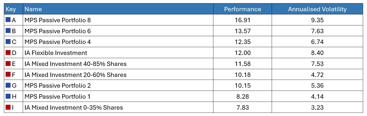 - Passive Portfolio 8, the highest-risk portfolio in the range, ranked in the top 11% of peers, demonstrating strong participation in a rising market environment.