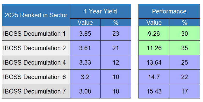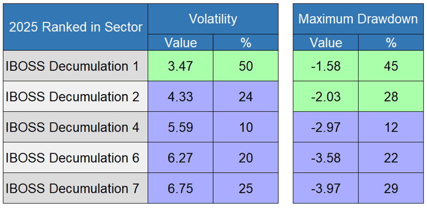 All IBOSS Decumulation outperformed their respective benchmarks in 2025 through a combination of fund selection and asset allocation as investors were rewarded handsomely for holding more diversified assets.