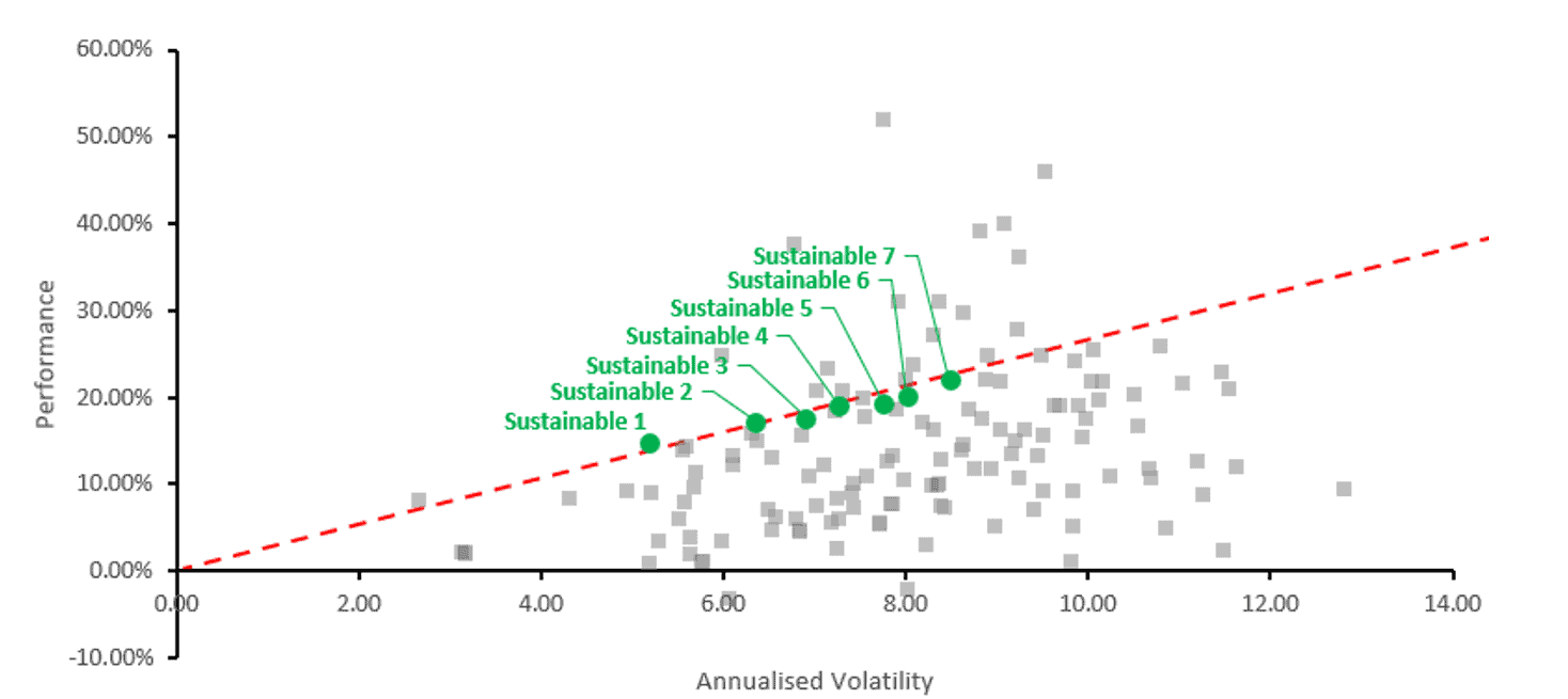 Each portfolio in the range ranked within the top 25% of actively managed sustainable peers, demonstrating effective portfolio construction and fund selection within a challenging environment. Over the year, the range generated returns of between 7.8% and 11.8% for clients across the various risk categories.