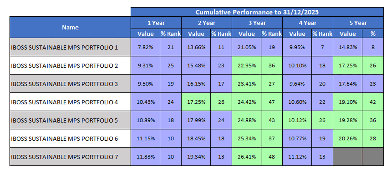 While sustainable strategies have faced headwinds in recent years relative to the broader investment universe, the IBOSS Sustainable Portfolios delivered strong relative performance in 2025.