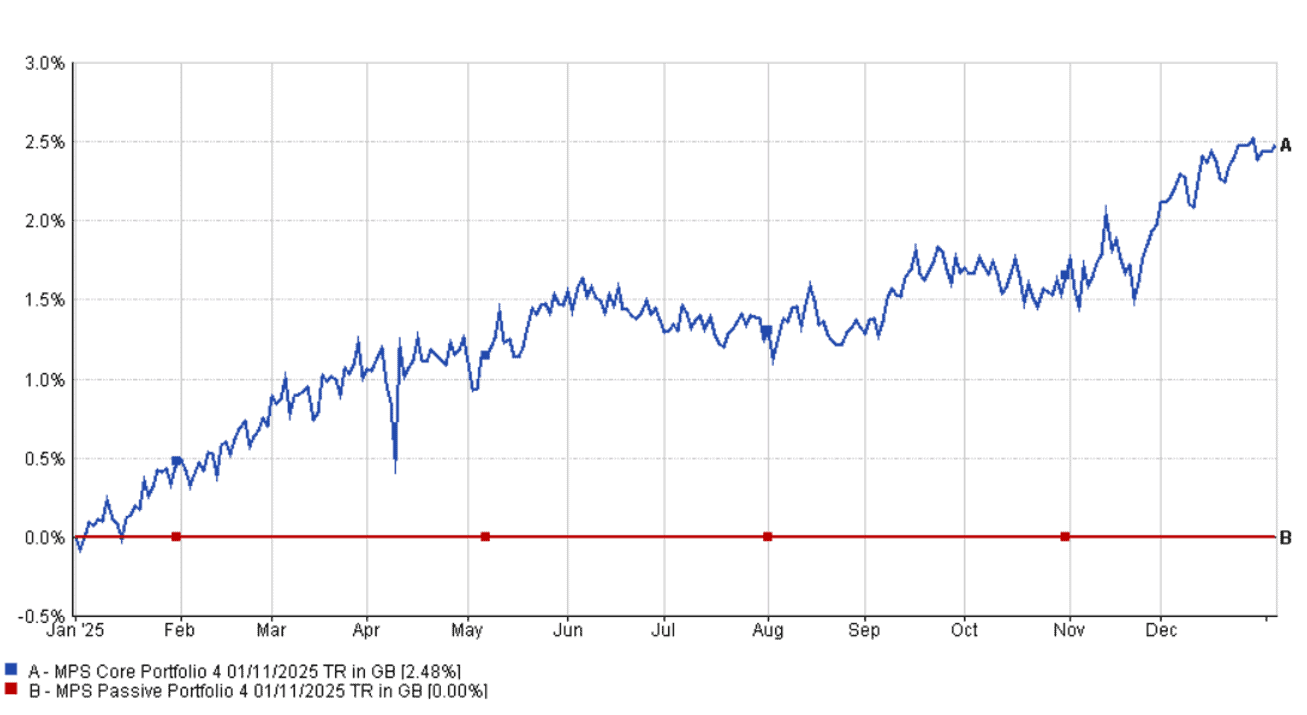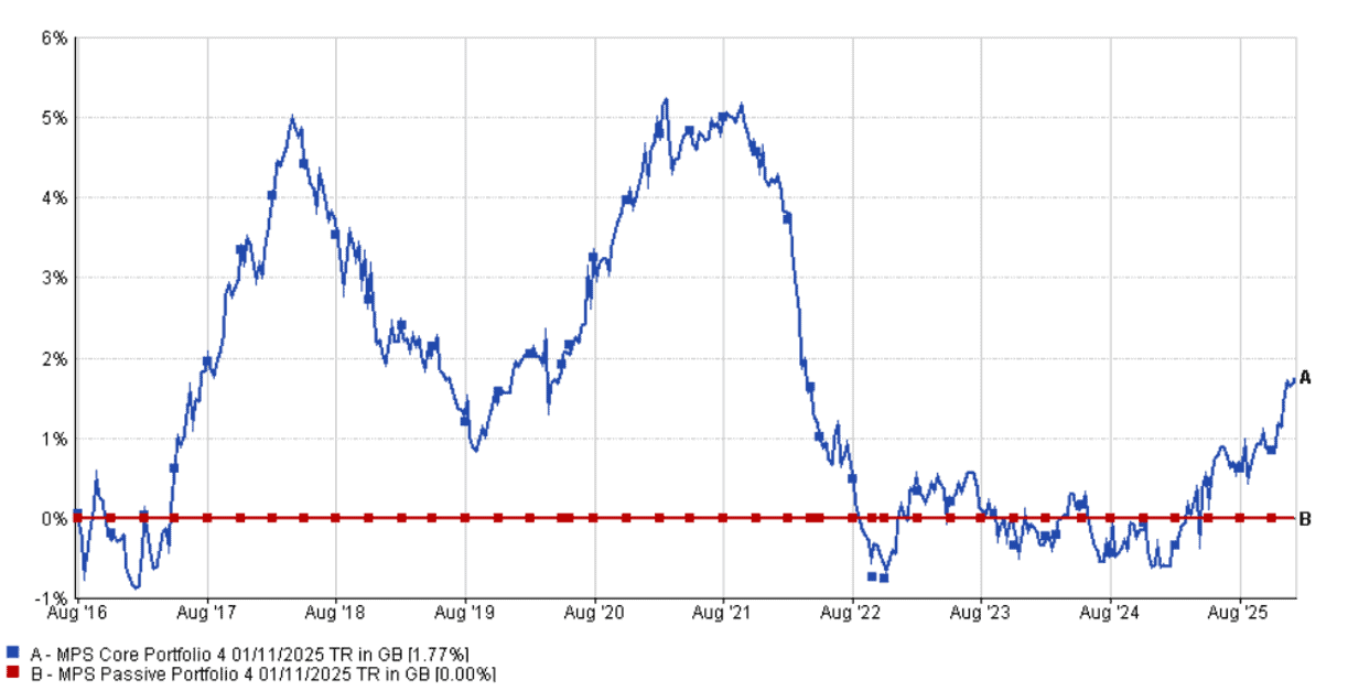 Market inflection points are often when the best active managers have the greatest opportunity to outperform their passive peers. As a result, we currently favour active management across most asset classes. To illustrate this, Figure 4 shows how our Core proposition has performed relative to its equivalent passive portfolio since the beginning of 2025, when we began to understand the implications of a Trump 2.0 world and DeepSeek’s arrival on the AI stage.
