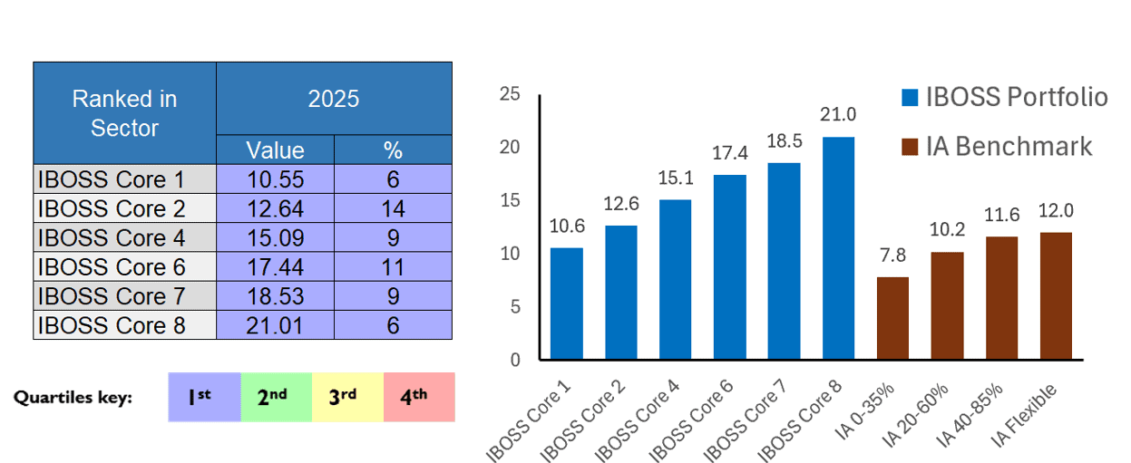 All IBOSS Core portfolios outperformed their respective benchmarks in 2025 by between 3% and 9%. The outperformance reflects the best year in IBOSS history as investors were handsomely rewarded for holding a more diverse range of assets across the risk ratings.