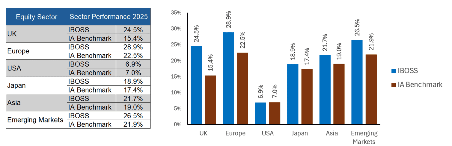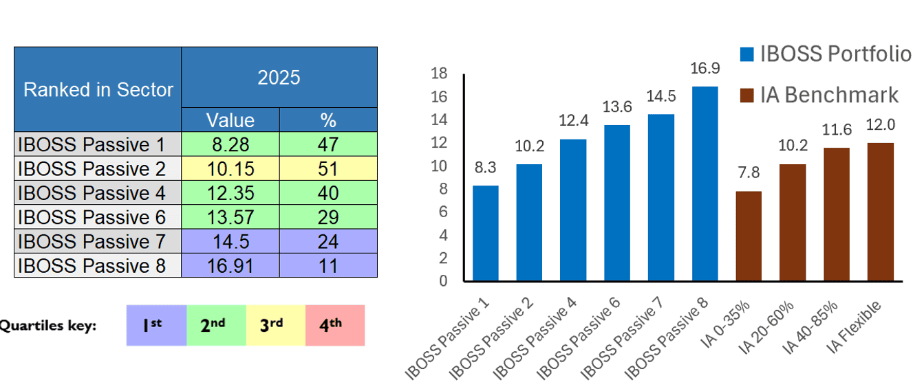 The majority of IBOSS Passive Portfolios outperformed their benchmarks in 2025. While overall outperformance was more muted compared with the Core range, the broader regional diversification within the passive portfolios proved beneficial throughout the year. As a result, the range delivered returns of between 8% and 17% for clients over 2025.