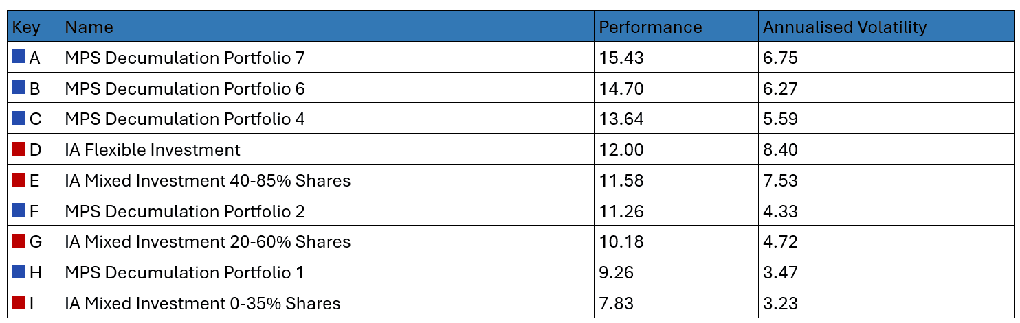 The scatter chart below highlights one-year performance versus annualised volatility, comparing IBOSS Decumulation Portfolios with IA peer group benchmarks. The results demonstrate strong risk-adjusted returns across the range, particularly at lower volatility levels.