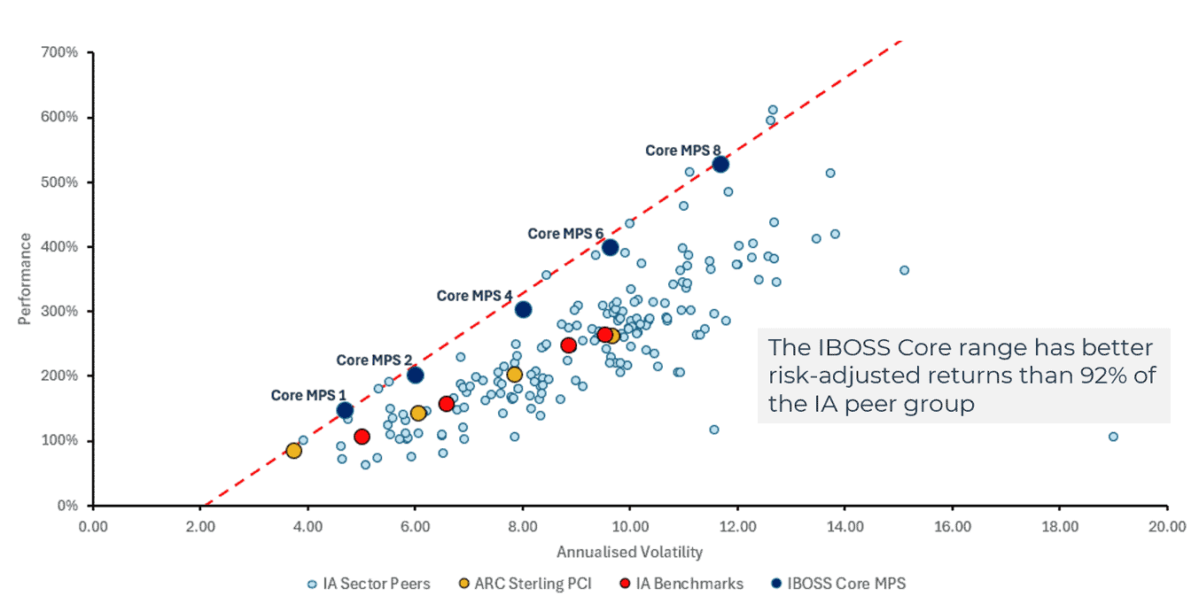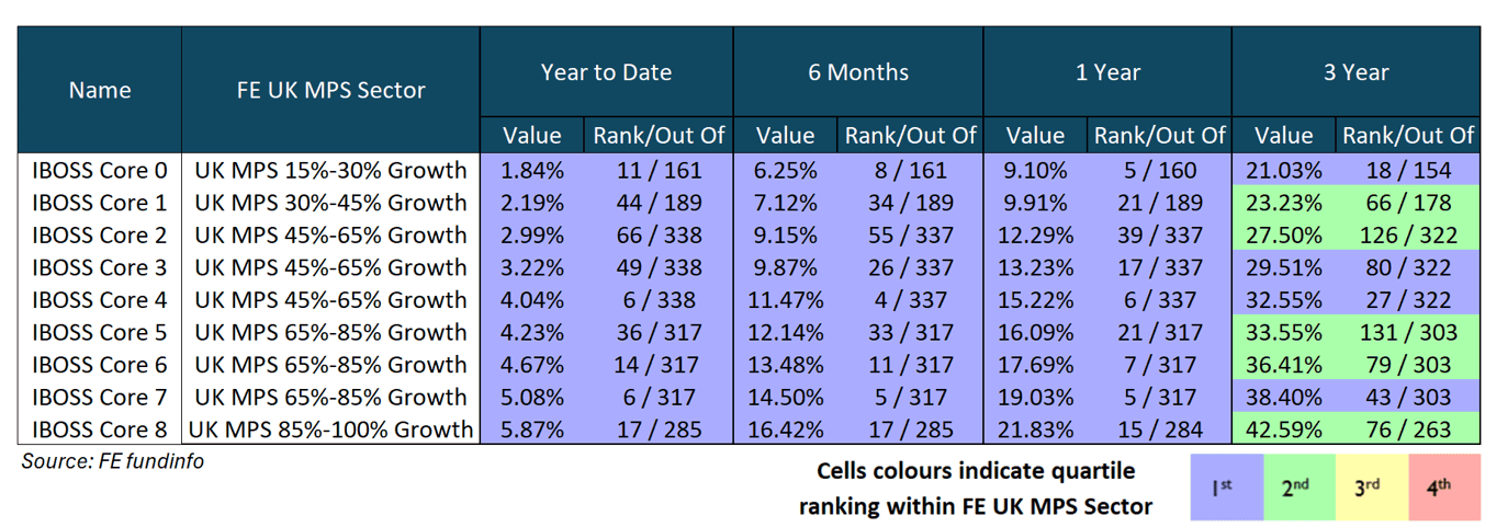 In addition, the portfolios have performed well relative to other multi-asset peers, as demonstrated by the chart below, which uses the FE MPS tool and ranks the IBOSS MPS portfolios against strategies with similar equity content.