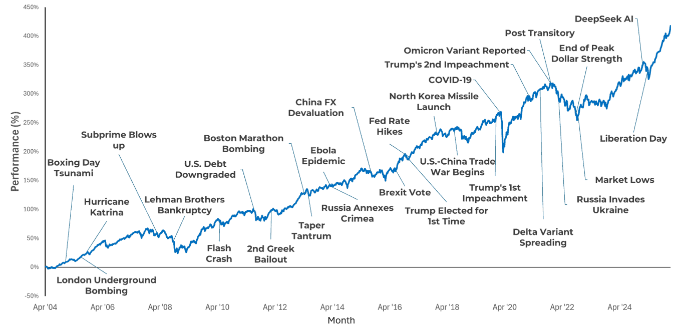 The chart below, taken from our “Why Stay Invested” pack, illustrates that while markets are never short of concerns, patient investors have historically been rewarded over time.